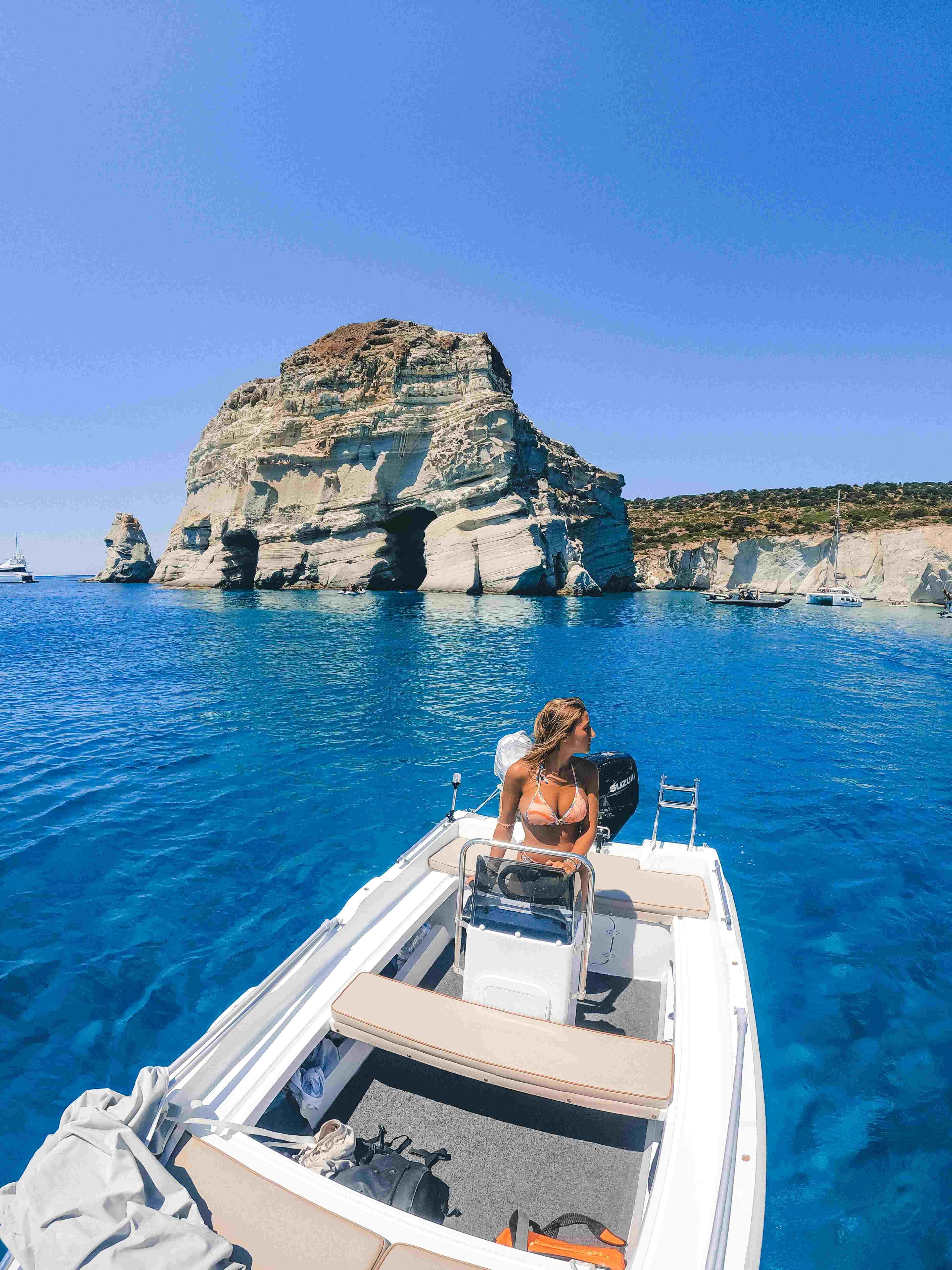 Rent a boat from Firiplaka beach, Milos and explore the seas like a real captain. No license required (basic understanding of boat operation and sea conditions is needed). You can rent a 30hp boat which you drive yourself, and reach Kleftiko, Tsigrado, Gerakas beach and more amazing places.
